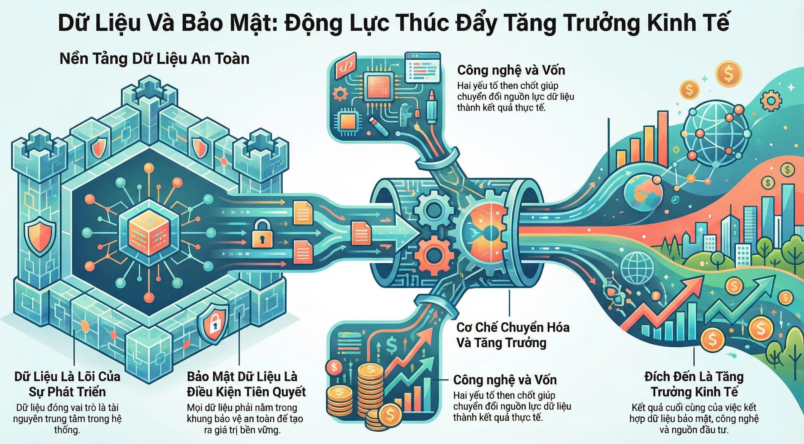 nghiên cứu trước đây và đưa ra các nhận định gắn với thực tiễn của Việt Nam. Kết quả nghiên cứu ghi nhận rằng, dữ liệu đóng góp vào tăng trưởng kinh tế theo các kênh khác nhau, điển hình như một loại vốn tư bản hoặc một công nghệ trong hàm sản xuất. Tuy nhiên, các đóng góp này cũng gặp phải ràng buộc về bảo mật dữ liệu, liên quan đến an ninh trong quản trị của quốc gia, năng lực cạnh tranh của doanh nghiệp và độ thỏa dụng của cá nhân. Vì vậy, đóng góp của dữ liệu vào tăng trưởng có thể tuân theo một hình thái phi tuyến tính mà điểm ngưỡng được xác lập bởi mức độ bảo mật dữ liệu. Cũng do đó, mỗi quốc gia cần xác lập được điểm giới hạn về sử dụng dữ liệu để vừa đảm bảo tính bảo mật dữ liệu mà vừa thúc đẩy được tăng trưởng kinh tế. Tại Việt Nam, điể